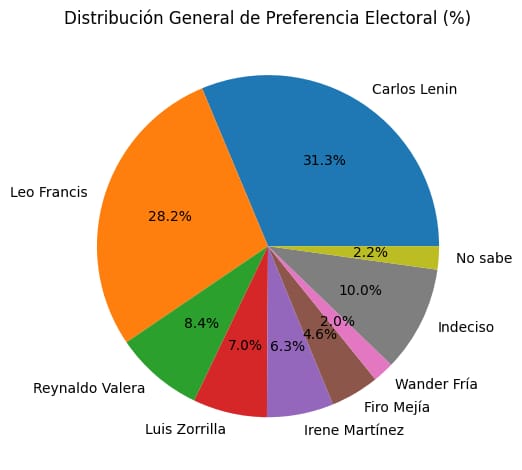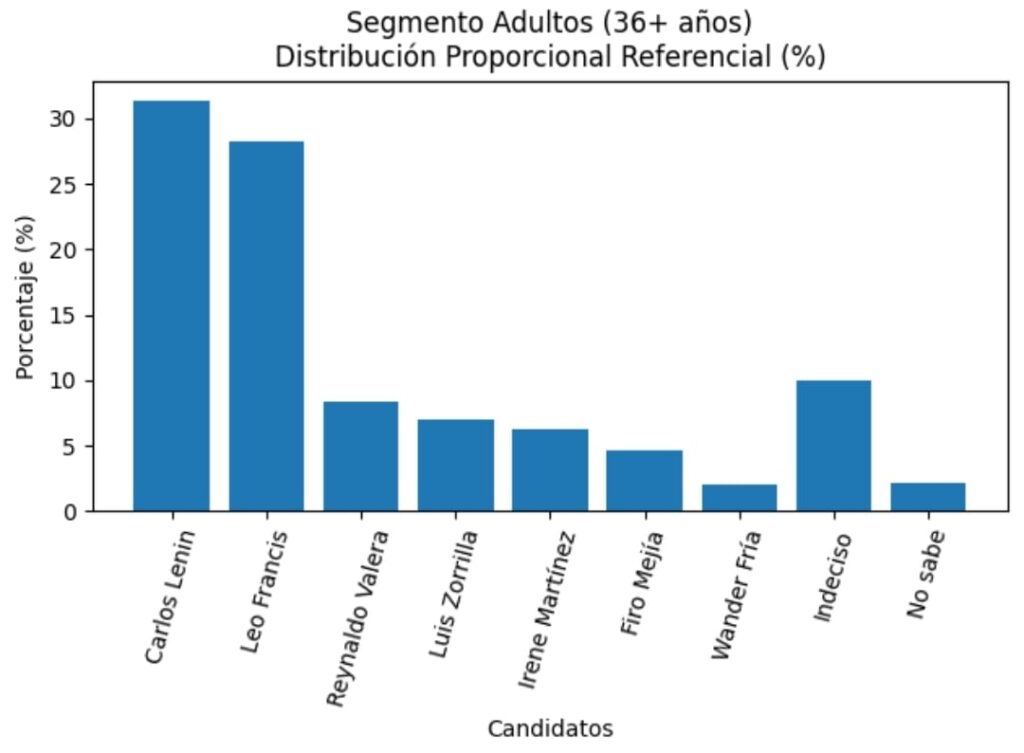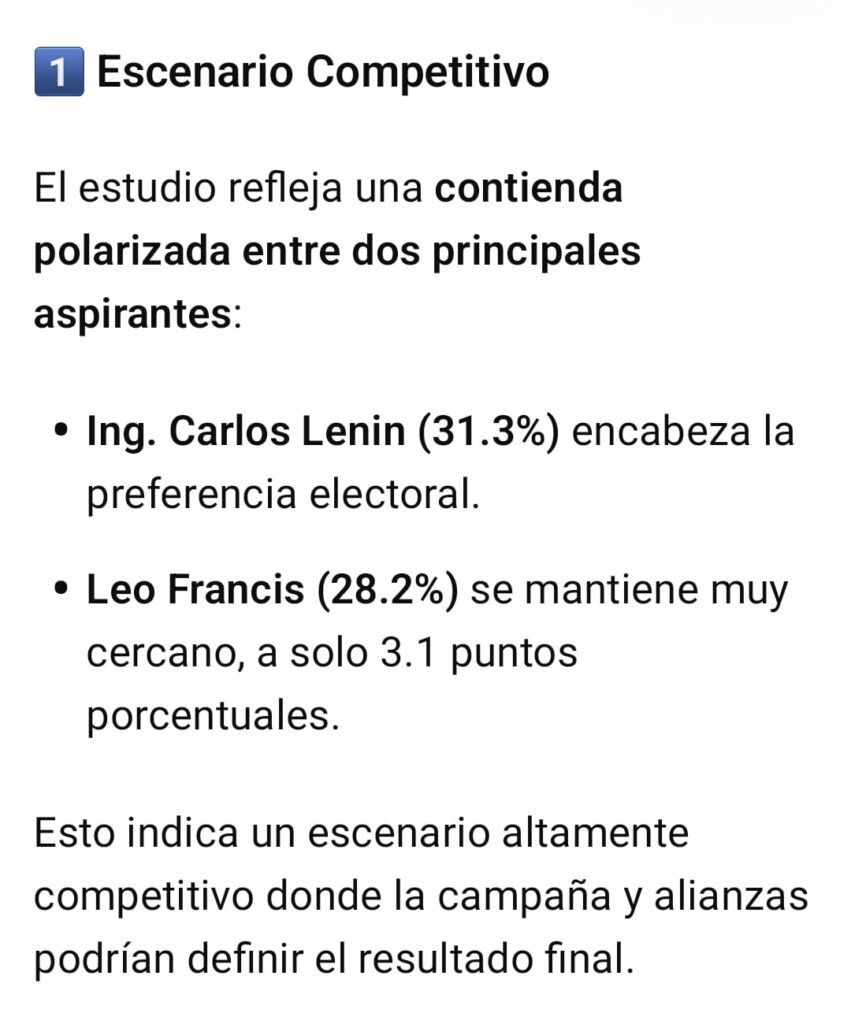 El Ing. Carlos Lenin (31.3%) encabeza la preferencia electoral, mientras que Leo Francis (28.2%) se mantiene muy cercano, a solo 3.1 puntos porcentuales de diferencia.