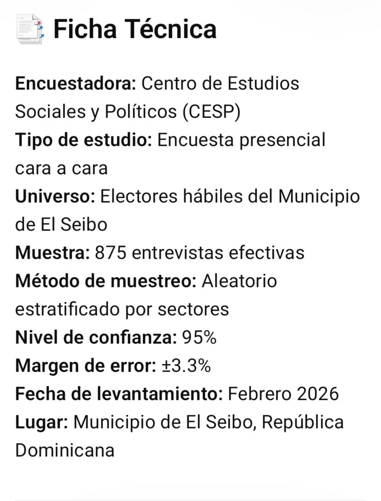 El Centro de Estudios Sociales y Políticos (CESP) presentó los resultados de su más reciente encuesta municipal sobre el escenario electoral de la Alcaldía de El Seibo para el período 2028–2032.